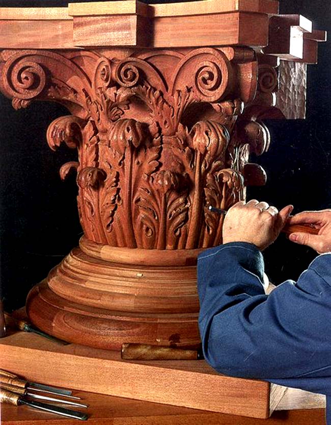 Individual expressive ornament is risky to execute whether it is architectural carving or a tattoo. It had better be well conceived or it will not wear well. According to Dimitrios Klitsas, master wood carver, the piece is an expression of the patron, not the artist. In performing a commission, the artist's task is to synthesize the client's vision and to extract it from the wood in a classic, enduring form. This outcome is best assured in a direct collaboration between patron and artist, without undue intermediation by design professional, contractor or woodworking artisan. "The client will have to live with it their whole life", he says, "to make them happy it needs to come from the heart." If the client is in a hurry or intent upon delegating all matters of taste, Dimitrios suggests that she would be better served by some of the clever and handsome mass produced ornament which is readily available in catalogs. The art of a master is less likely to fit into a construction schedule and more likely to test the limits of the client's patience and willingness to engage. For a client who knows exactly what she wants the process can be simple. A patron with professional expertise in period furniture recently commissioned a table in the French Baroque, stipulating only that the design include no figures, a form typical of the style but not to her taste. From their discussions he produced one full, detailed front elevation of the piece, on paper, which she accepted, without changes. To insure that he got exactly the table he wanted, he built it himself in his own woodworking shop. Dimitrios emphasizes that he knows of many very accomplished furniture makers in the country today but that he feels the particular skill of joining work with the swooping lines of the Baroque is not widely practiced here. The material is basswood, a smooth grained hardwood which readily accepts the undercuts necessary for the exuberant detail the period requires. This particular carving took twenty months to complete, with deliberate rest periods intended to allow the artist and the work to absorb the changes and maintain their direction. He noted that since carved work emerges in three dimensions, it creates a multitude of viewpoints, all of which the artist must address. Not every client possesses such clarity and ambition as the patron of the Baroque table. How can a less knowledgeable client justify the expenditure when a workmanlike approximation can be had for a fraction of the cost? Dimitrios answers, "Woodcarvings look new every time. You can never look enough. They surprise us and delight us again and again." Is that because a carved piece changes from each of the many of vantage points? He points to a deeply undercut rose in white oak. The painstaking undercutting of the wood carver's art multiplies these vantage points and helps to give the work an active, living presence. The goal of training in the classical tradition, he says, is the artful depiction of the natural world. He displays as showpieces two classical architectural details, a bracket and a capital, both bearing flourishing, animated acanthuses, in basswood. Nearby stands a free standing acanthus, waving slightly in a breeze, also in basswood. Rosanna Coyne, his assistant and long time student, left her work to come over to comment. "What we learn is how to see. I notice something new here almost every day even though I have been walking by these pieces for months or years," referring to the many works in progress lining the walls. There are pieces within these pieces that have yet to be seen, even perhaps by the artist. In order to effectively employ the woodcarver's art, Dimitrios recommends that the client visit him at his studio. When I visited, he and his assistant were working on identical Georgian laurel leaf freize ornaments in mahogany. Around the studio were numerous pieces in progress, shelves of art books and, in an adjoining room, rows of student benches pushed up against the wall. His studio is a school as well as a busy production studio and there is an atmosphere of excitement about producing art. The question that he wants to ask the client is simple, "What do you like to see? What in the natural world do you turn to for happiness?" A visiting client had built a modern timber frame home and knew only that they wanted to put a small touch of ornament in the massive slab of white pine over the hearth. With Dimitrios, they looked at pictures of the house, its setting and its materials and talked about what it meant to them. Vines were suggested, but in the end they decided on a single pine bough bearing cones as being more fitting. By learning about the client's taste in an environment where the carver's art can readily be understood, Dimitrios is confident that his commission will fulfill its purpose, to furnish enduring delight. LEARNING TRADITIONAL WOODCARVING FROM A MASTER Dimitrios Klistas and his art are heir to a classical lineage of many styles which draws upon a long refined tradition. This lineage has not generally prospered in our time but nonetheless has come to a vigorous flowering in his school for woodcarving where a dedicated community of students gather to study with the master carver and teacher. He teaches the skills of the professional artisan, as they were taught to him, beginning with how to stand before the work and how to hold and maintain the tools. Self taught carvers of long experience have said that they are now able to work long hours without pain because of finally learning these basic skills. Every student has different goals and abilities, but if they can apply themselves and respect the tradition, he welcomes their commitment and will work with them to see that they progress. It was by good fortune that Dimitrios was brought into this tradition. In his youth, in his home town on the Greek mainland, he went to a technical school where professional woodcarving was taught. The teacher happened to be 