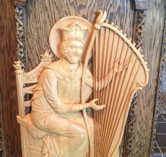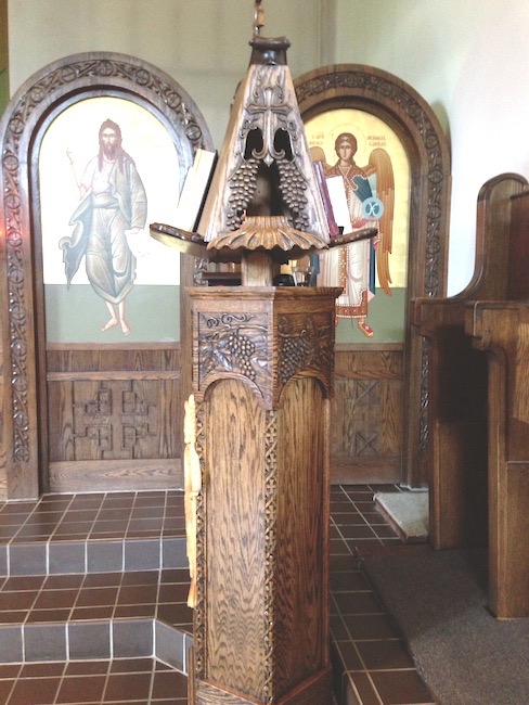 This traditional Greek Orthodox chantor's stand features cabinets and a two-sided rotating top in oak and basswood. This is a piece of liturgical furniture built to display and store books during service. Built and carved by Dimitrios and dedicated to his parents, this piece was donated to St. Luke’s Greek Orthodox Church in East Longmeadow, Massachusetts. The grapevine is a recurring theme in liturgical furniture, in reference to the scripture, “I am the vine, ye are the branches: He that abideth in me, and I in him, the same bringeth forth much fruit.” And so the oak stand itself depicts the vine and grapes. The bas relief depicts King David, with his harp, the composer of the Psalms. This was carved from a two inch thick slab of contrasting basswood, secured from the inside with screws.