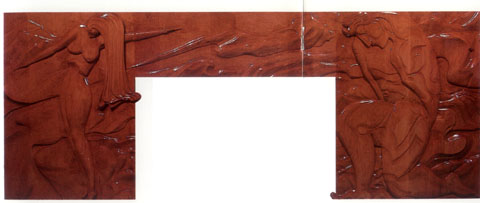 Produced from a sketch by New York architect Bill Green, this Art Deco fireplace surround was produced out of three sections of maple. Dimitrios took delivery of three sections, all two inches thick, from a New York woodworker. Total area of the fireplace surround was twelve feet by five feet.