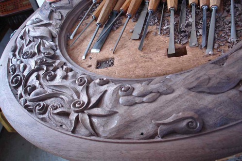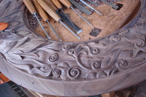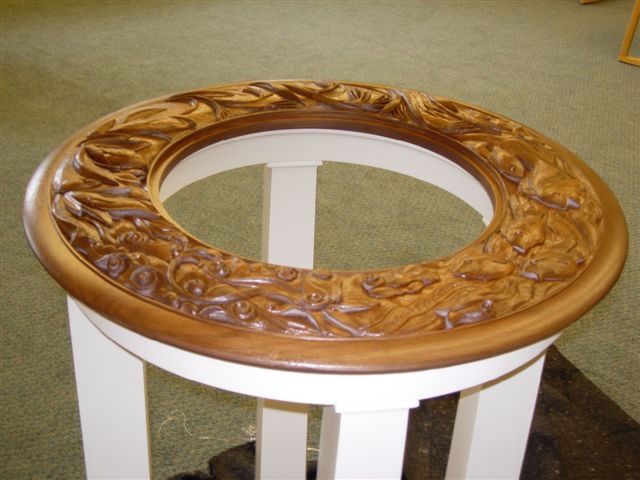 A Chicago architect requested this round baptismal font frame as a commission for a Protestant Church. The round frame was milled out of walnut by a Chicago area woodworker and shipped to Dimitrios. The architect provided a sketch on a water theme, including fish, wetlands and waves, which Dimitrios carved into the walnut. The woodworker also provided a stand, which can be seen here.