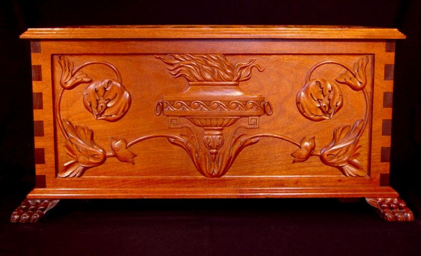 This chest was designed and built by Dimitrios, out of mahogany, in an eclectic Baroque style. It can be seen in his studio, as a show piece for patrons and students.