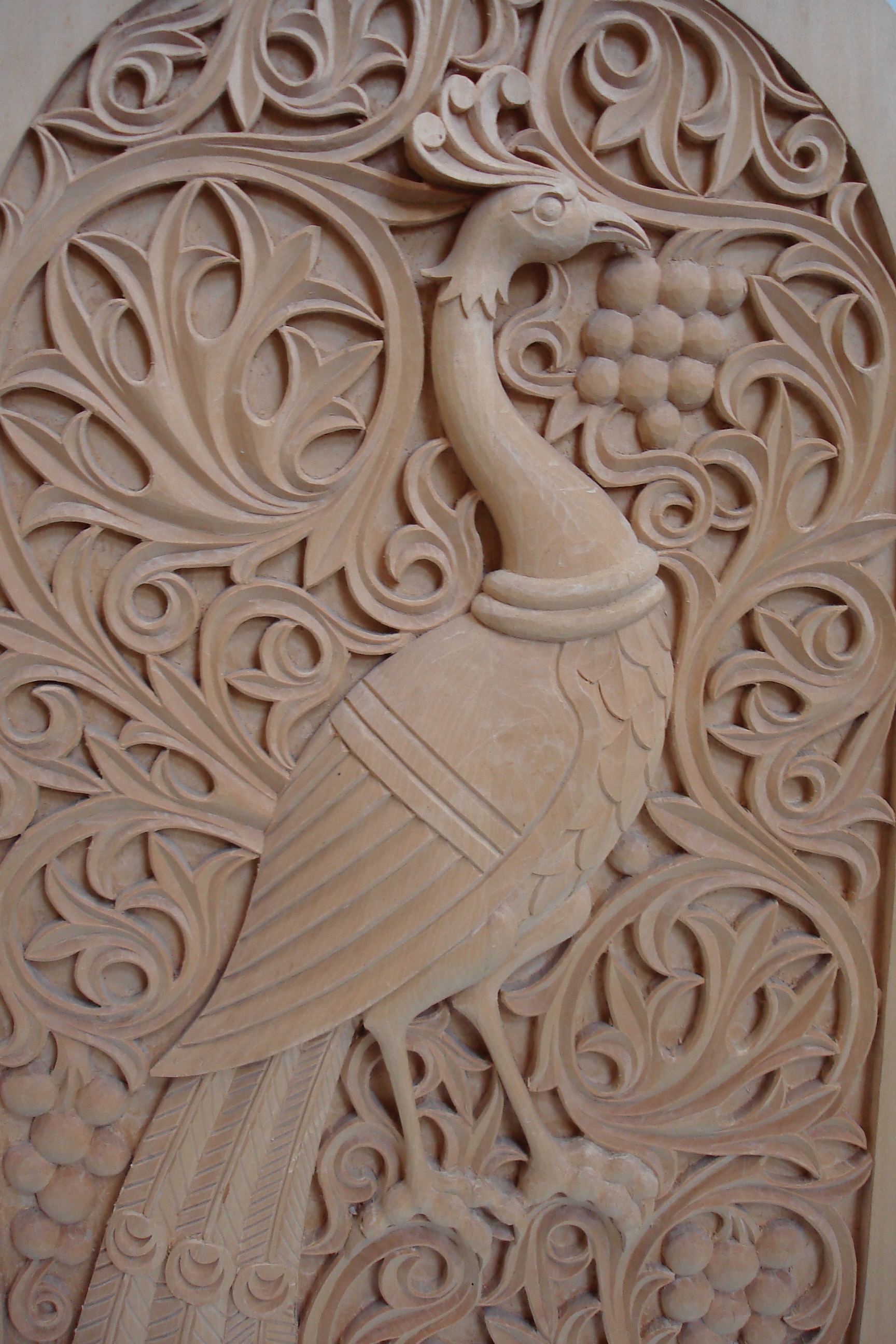 Byzantine style panel of a peacock eating grapes, an image rich in meaning for the Orthodox Church. This is a recurring theme for Dimitrios. The work is in basswood, as are many of his formal liturgical pieces. This piece is religious in form, and more formal than a similar peacock panel, yet the artist has still permitted himself expression and interpretation. This piece is on loan for study. It is not sufficiently formal for the liturgical environment. Dimensioned about 14” x 22”.