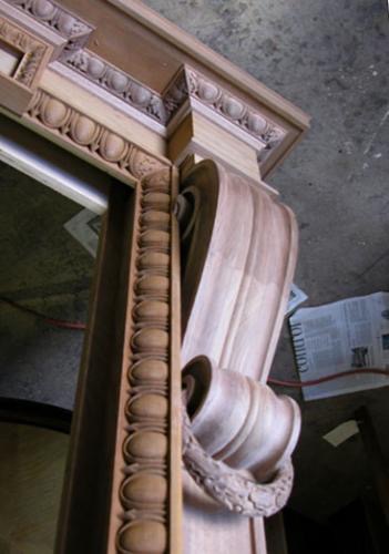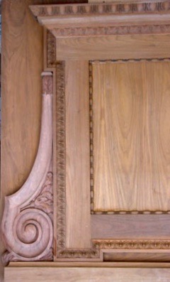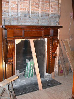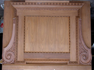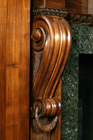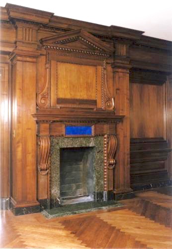 This complex walnut mantel and overmantel were to provide the focus for this heavily ornamented panelled library. The detailing is distinctive but in conformity to the Louis IVI style of the room. The room was designed by well respected Chicago classicist architects Hamm Rockavitch, who furnished full size drawings for all of the details.