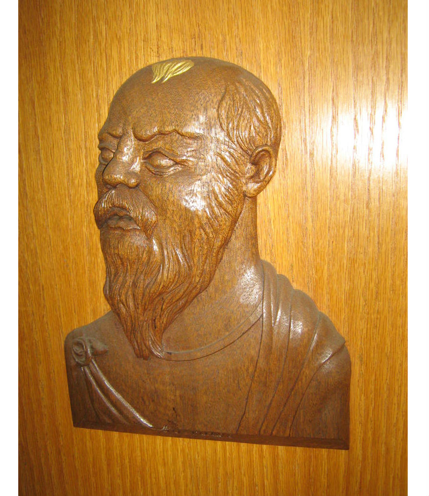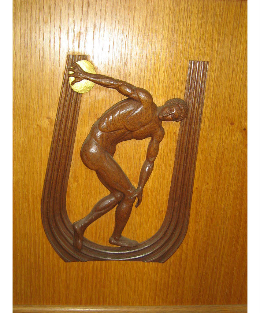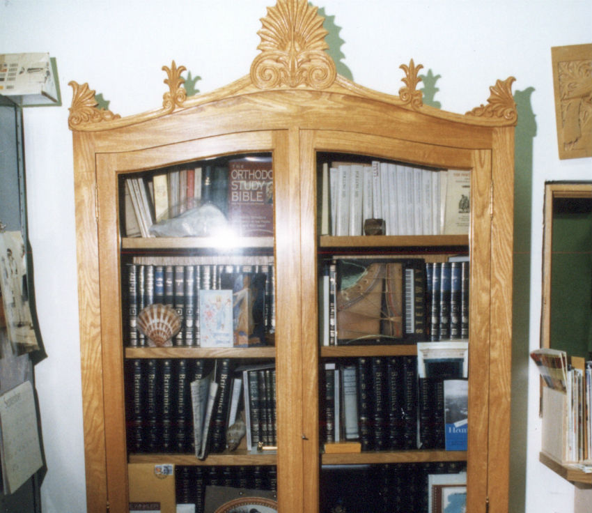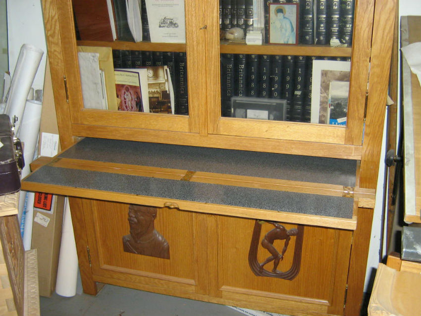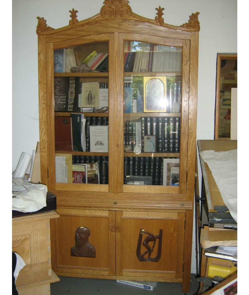 This oak cabinet was built by Dimitrios in an Ionic style (note pediment) and can be seen in his studio. He is an accomplished furniture maker and cabinetmaker as well as a master wood carver. It was designed to hold a part of his studio library, the books he consults with most frequency. Note the concealed reading table that pulls out, when needed. The lower panels are decorated with applied mahogany reliefs, set off by selective gilding. This work illustrates the ancient Greek motto, “Healthy mind, healthy body”. On the left panel, we see the philosopher, on the right, the Olympic athlete.